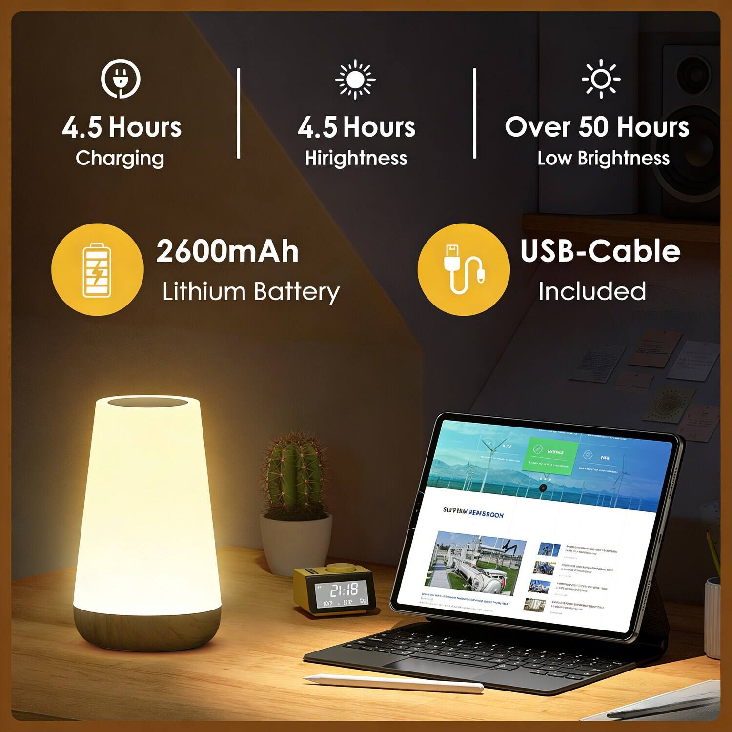 ● Powered by a 2600mAh rechargeable battery, this lamp offers impressive flexibility with a working time ranging from 4.5 to 50 hours depending on brightness and mode. It charges fully in approximately 4.5 hours via a standard DC 5V USB connection, making it easy to keep powered whether at home or on the go. Its cordless design allows you to place it anywhere without limitations.
