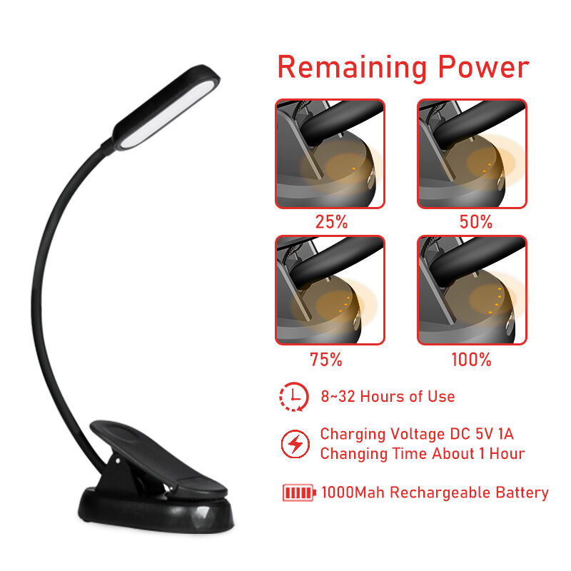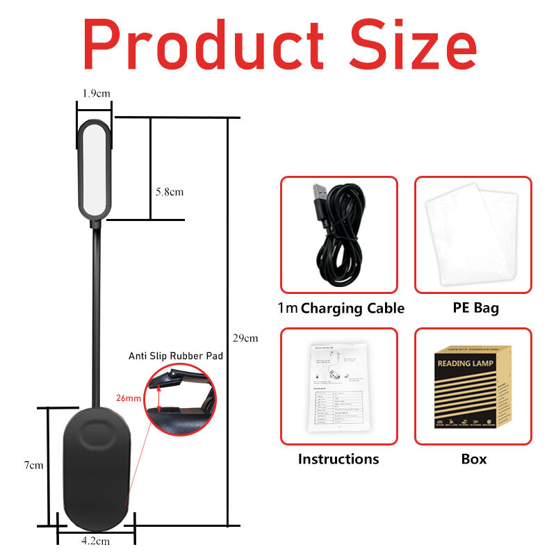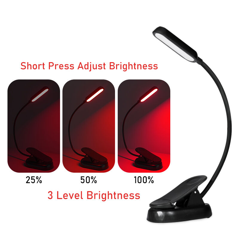 No Blue Light 1.5W 120lm Led Book Light 625~630 nm 660/670 nm Red Color 3 Level Brightest Reading Light Black Body